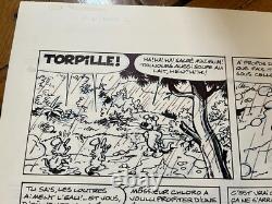 Magnifique planche originale à l'encre de chine de Walli (André Van der Elst), le successeur de Raymond Macherot, pour la série Chlorophylle. Chlorophylle et Minimum sont présents dans chaque case et Torpille à 7 reprises.